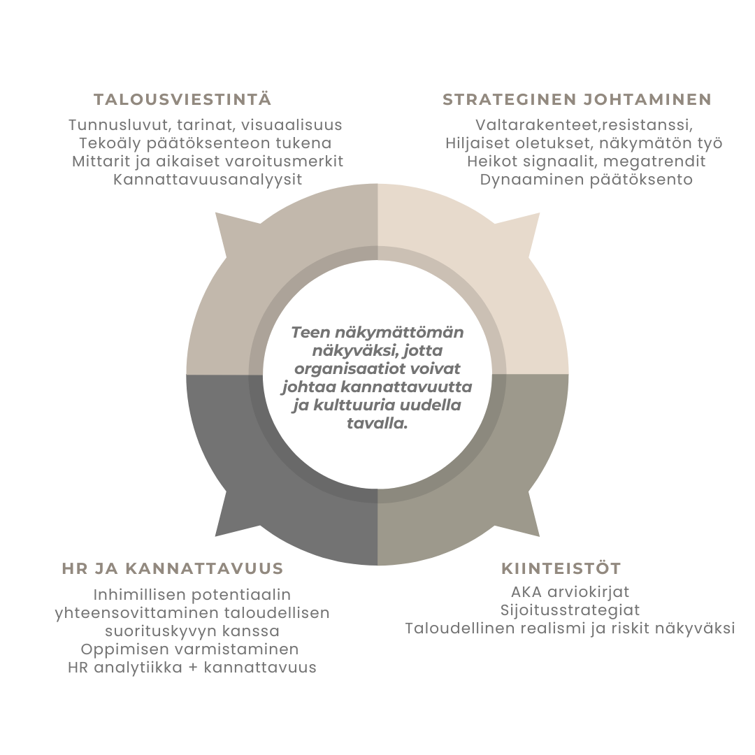 Minulla on laaja kokemus yritysmaailmasta johtajana ja talousjohtajana, akateemisesta työstä sekä kiinteistöistä. Yhdistän tutkimustiedon ja käytännön kokemuksen selkällä tavalla. Tarjoan elämänmakuisia ja vaikuttavia koulutuksia, keynoteja ja sparrausksia esimerkiksi seuraavista teemoista: